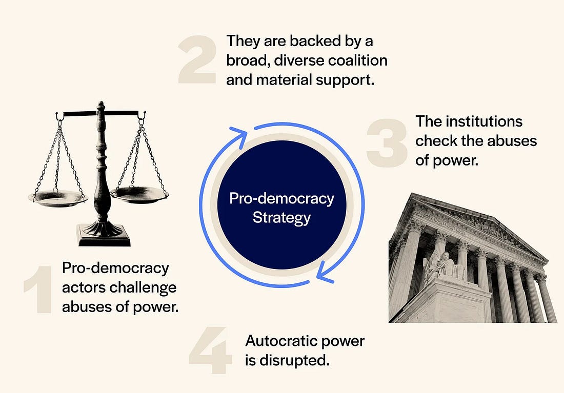 Prioritize safety: Make it clear that autocrats represent a culture of death and violence. While demanding radical changes, pro-democracy actors must condemn political violence even when it benefits them. This includes repsecting court orders, calling out corruption even on our own side, and evaluating the security of communities and individuals. Proactively work towards increasing safety and protecting from those who would do harm.