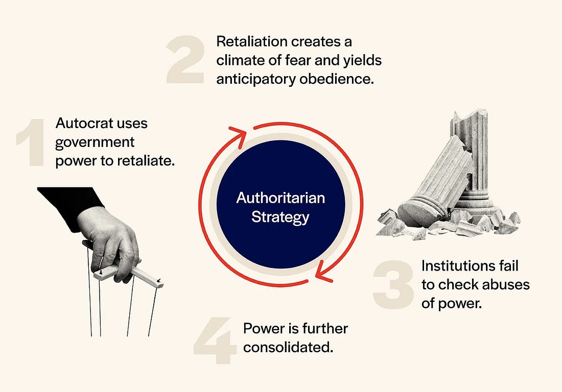 - Issue: Fear is the domination emotion of all authoritarian regimes and it is what drives people to comply in advance. If one group or person is targeted - others will fall in line to avoid their fate. Threats of deportation (especially after supreme court rulings that people can be sent to places other than their country of origin) or financial subjugation can also be form of violence. This is not always as overt as physically attacking someone. In addition to Trump's above-the-surface-actions, he has allegiance with several right wing extremists groups who have already carried out violence in line with his agenda from SWAT raid calls, doxxing, harassment and even physical violence.
